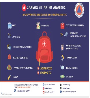 «Δημιούργησε, προληπτικά, το δικό σου σακίδιο έκτακτης ανάγκης με βασικά προϊόντα, το οποίο θα μπορείς εύκολα να μεταφέρεις σε καταφύγιο, στο ενδεχόμενο που θα δοθούν σχετικές οδηγίες από τις αρμόδιες Αρχές» αναφέρει η ανακοίνωση. Στην σχετική φωτογραφία το υπουργείο Εσωτερικών καλεί τους πολίτες να δημιουργήσουν το σακίδιο έκτακτης ανάγκης έχοντας μέσα νερό, σφυρίχτρα, προσωπικά είδη υγιεινής, ζεστό ρουχισμό, τρόφιμα μακράς διάρκειας, φανάρι, κουτί πρώτων βοηθειών, μπαταρίες, φορητό φορτιστή, ραδιόφωνο με μπαταρίες, πολυεργαλείο, μάσκα και μετρητά.