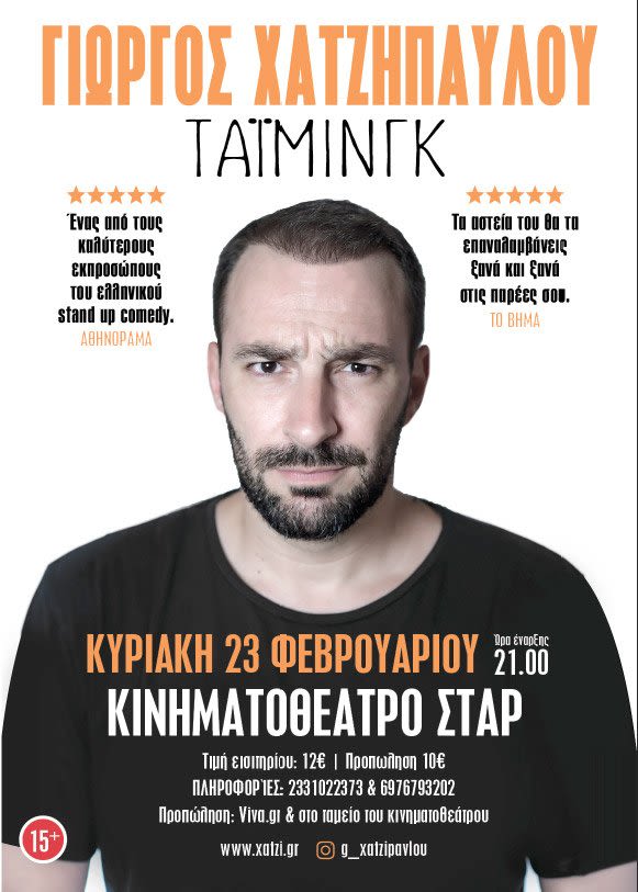 Ο Γιώργος Χατζηπαύλου έρχεται στη Βέροια ¨την Κυριακή 23 Φεβρουαρίου 2020 στις 9.00 μ.μ.,στο Κινηματοθέατρο ΣΤΑΡ της Βέροιας, με την επιτυχημένη stand up comedy παράστασή του με τίτλο «Τάιμινγκ».