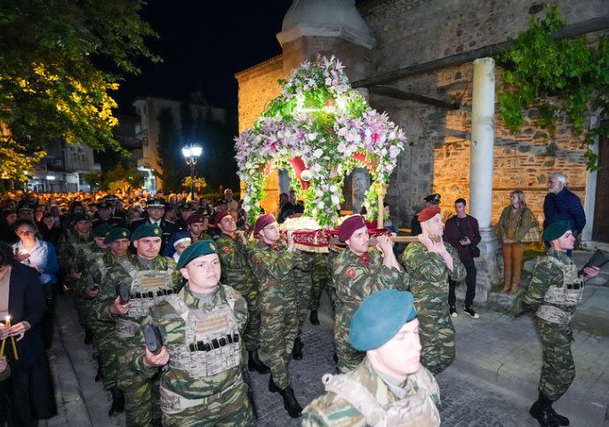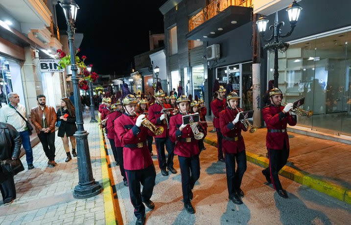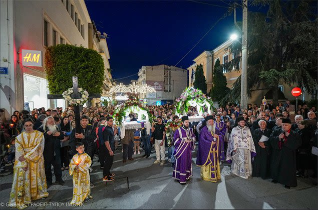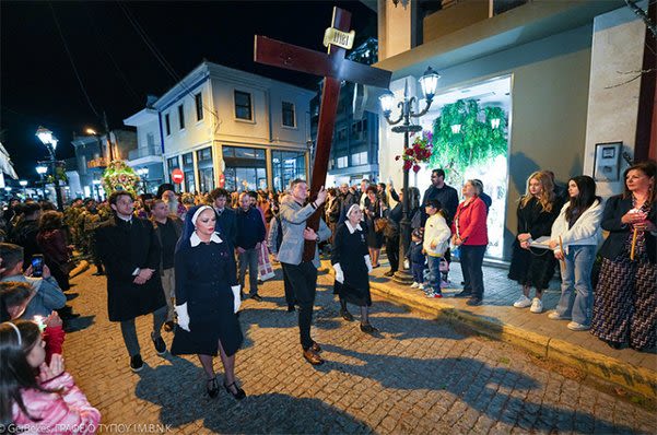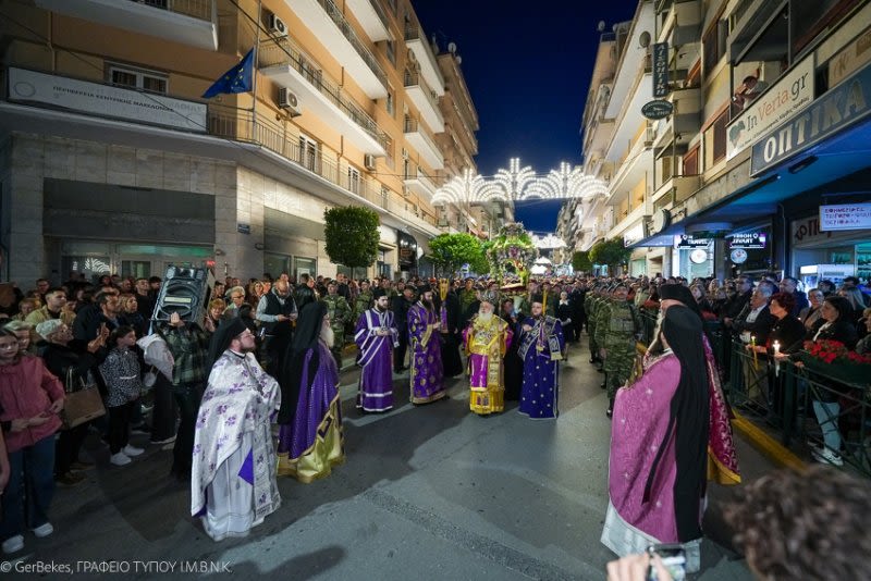 Ακολούθησε η καθιερωμένη περιφορά του Επιταφίου στους κεντρικούς δρόμους της πόλεως και η συνάντηση με τους Επιταφίους της ενορίας του Αγίου Ιωάννου του Ελεήμονος (παρεκκλησίων Αγ. Σπυρίδωνος και Αγ. Στεφάνου) μπροστά από το Δημαρχείο της πόλεως.