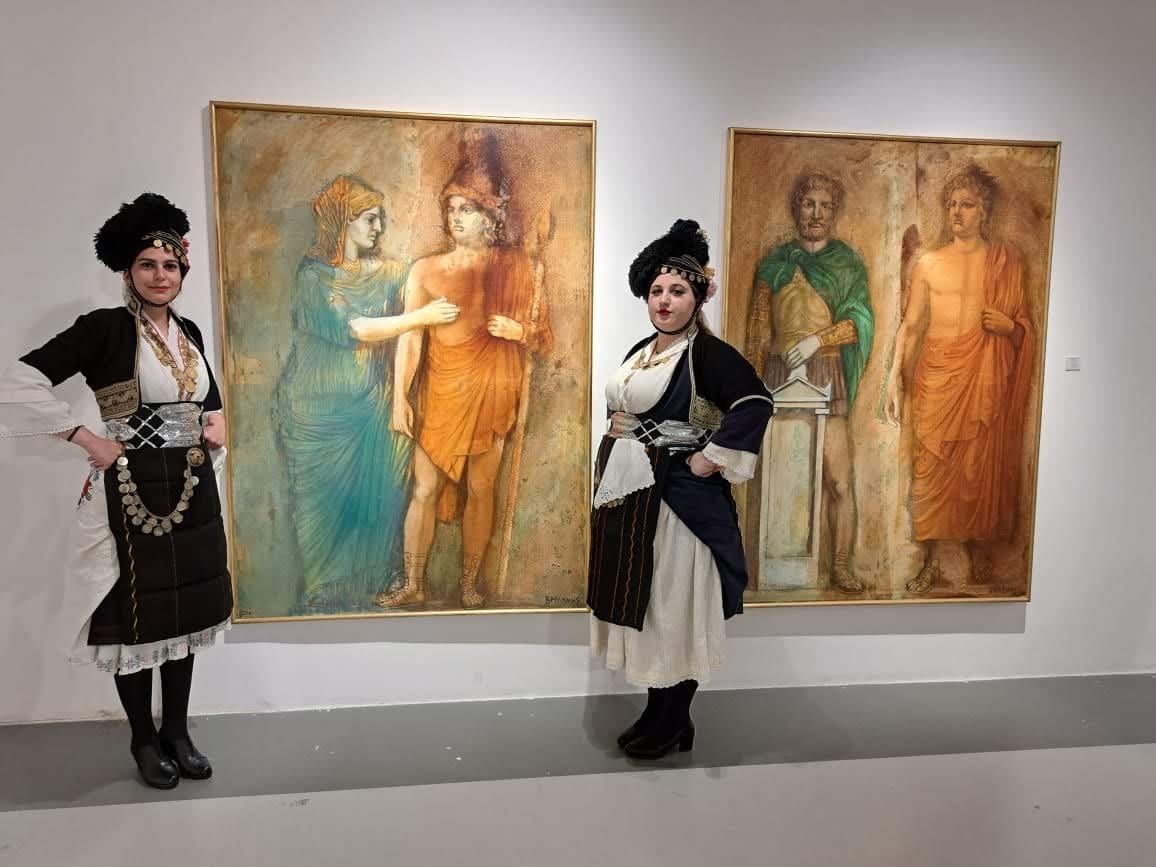 Οι κοπέλες από το Πολιτιστικό Σύλλογο Βεργίνας με τις παραδοσιακές στολές τους μπροστά από τα έργα Βαρλάμη της συλλογής Μέγας Αλέξανδρος στην παρουσίαση στο Κουβέιτ (2023).