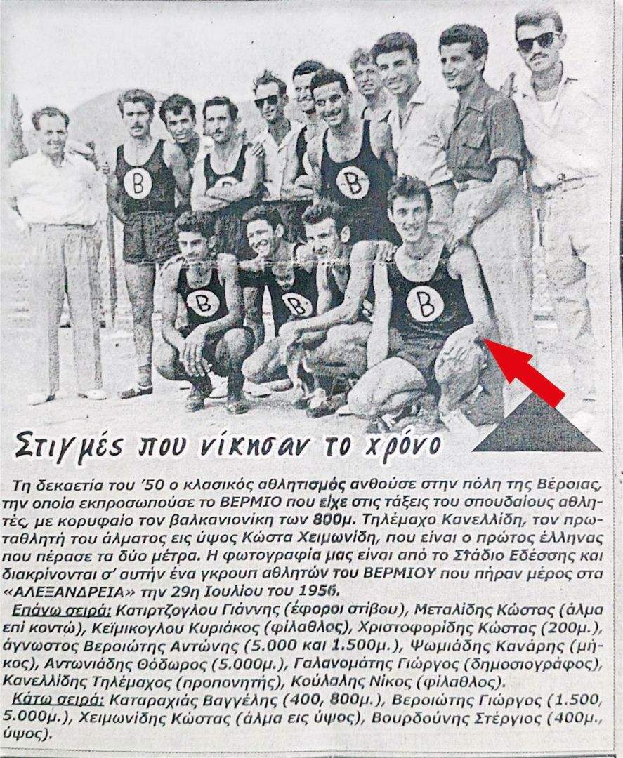 Στην φωτογραφία πηγαίνουμε πίσω στην δεκαετία του ’50, όταν ανθούσε στη Βέροια ο κλασσικός αθλητισμός, με κύριο εκπρόσωπο τον σύλλογο ΒΕΡΜΙΟ. Στο στάδιο της Έδεσσας, εικονίζονται αθλητές στίβου του ΒΕΡΜΙΟΥ, που συμμετείχαν στα «ΑΛΕΞΑΝΔΡΕΙΑ» την 29η Ιουλίου 1956. Στην κάτω σειρά δεξιά διακρίνεται ο Στέργιος Βουρδούνης σε ηλικία 23 ετών, ο οποίος συμμετείχε στους αγώνες στα αθλήματα των 400μ. και του ύψους, υπό την καθοδήγηση του προπονητή και μεγάλης μορφής του βεροιώτικου αθλητισμού, Τηλέμαχου Κανελλίδη (επάνω σειρά 2ος από δεξιά).