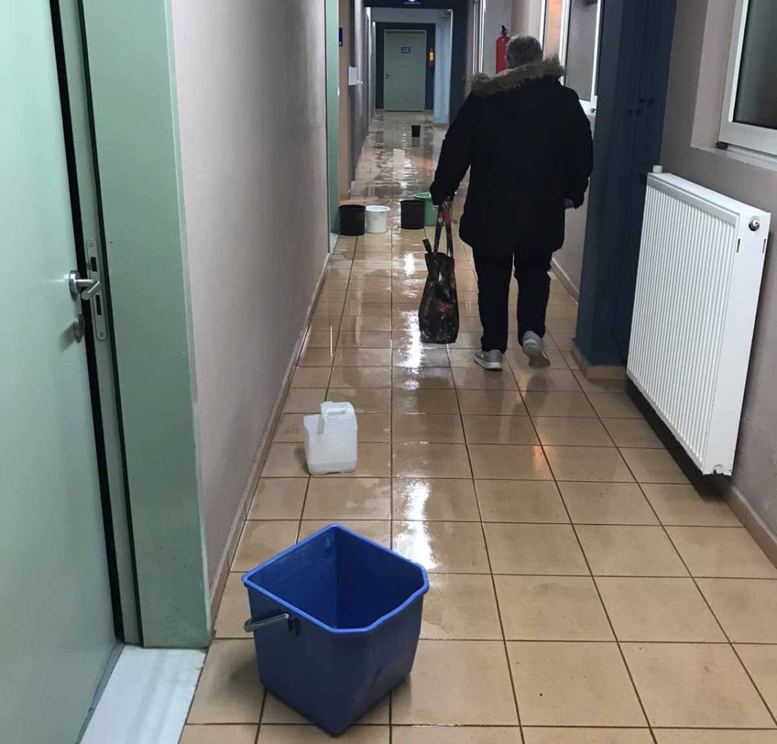 Με κουβάδες συλλέγονται τα βρόχινα νερά που στάζουν από την οροφή. Έτσι αντιμετωπίζεται η απουσία συντήρησης των αθλητικών εγκαταστάσεων ενώ οι αθλητές μας, τα παιδιά μας και οι κηδεμόνες τους επιδίδονται καθημερινά σε φιγούρες ισορροπίας, προκειμένου να διασχίσουν με ασφάλεια τον διάδρομο που οδηγεί στις πισίνες.