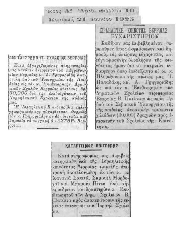 Στεγάζεται σε κτήριο τεσσάρων αιθουσών ιδιοκτησίας της τοπικής εβραϊκής κοινότητας επί της οδού 10ης Μεραρχίας, δίπλα απ’ το πατρικό της οικογένειας Άλβο. Με πρωτοβουλία των πληρεξουσίων Ι. Παπαδάκη και Α. Γρηγοριάδη, τον Ιούνιο του 1925 εξασφαλίζεται γενναίο (για την εποχή) κονδύλιο ύψους 30.000 δραχμών από το Υπουργείο Παιδείας για την εκ βάθρων ανακαίνισή του. Την ευθύνη του εγχειρήματος αναλαμβάνει η αιρετή τριμελής Σχολική Επιτροπή αποτελούμενη από τους : Χανανιά Σαπιτά, Σαμουέλ Μαρδοχάι, Βαρούχ Πίντο. Με την ολοκλήρωση του έργου, εντάσσεται πλέον στο ελληνικό εκπαιδευτικό σύστημα με τον τίτλο «Ισραηλίτικο Δημοτικό Σχολείο Βέροιας» υπό την επίβλεψη του Επιθεωρητή Δημοτικών Σχολείων Βέροιας. Σε έκθεση-καταγραφή του 1935 καταχωρείται από τον τότε Επιθεωρητή ως «…οπωσδήποτε καλής κατάστασης», ενώ εκτιμάται η αξία του στο ύψος των 100.000 δραχμών.