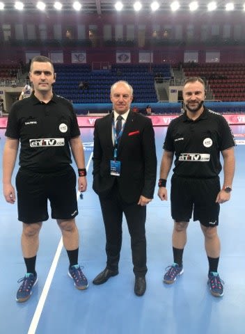 Στον αγώνα Μότορ Ζαπορόζιε-Πόρτο Σοφάρνα ( 33-29, ημίχρονο 19-16 ) στην Ουκρανία, για το VELUX EHF Champions League, η ελληνική σημαία ήταν ψηλά στον ιστό στο ΄΄Παλάτι των Σπορ΄΄ στο Ζαπορόζιε, χάρη στην εκπροσώπηση της χώρας μας με την παρουσία του παρατηρητή αγώνα, κ. Γιώργου Μπεμπέτσου ( στη φωτο μαζί με τους διαιτητές από την Σερβία, Μάρκο Μπόρισιτς, Ντέγιαν Μάρκοβιτς ).