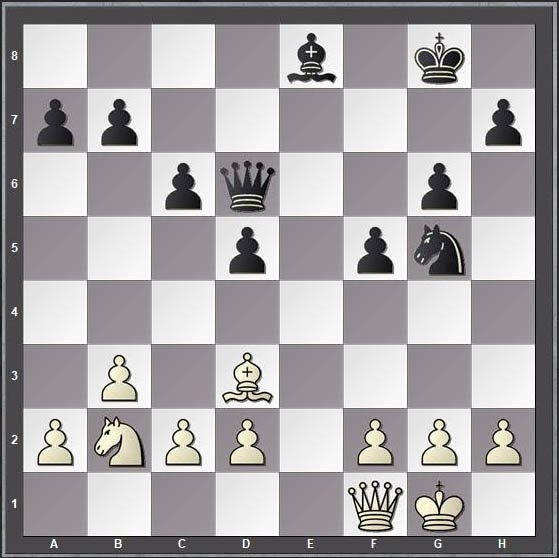 1.e4 e5 2.Nf3 Nc6 3.Bb5 Nf6 4.0-0 Nxe4 5.Re1 Nd6 6.Nxe5 Be7 7.Bd3 0-0 8.Qh5 f5 9.Nc3 Nxe5 10.Rxe5 g6 11.Qf3 c6 12.b3 Nf7 13.Re2 d5 14.Bb2 Bf6 15.Rae1 Qd6 16.Re8 Bd7 17.Rxa8 Rxa8 18.Nd1 Ng5 19.Qe2 Re8 20.Qf1 Bxb2 21.Rxe8+ Bxe8 22.Nxb2