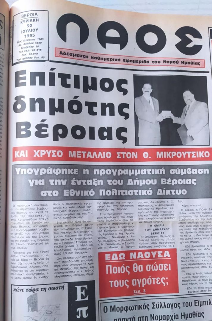 Με αφορμή την προχθεσινή απόφαση του δημοτικού συμβουλίου Βέροιας για την ονομασία του θεάτρου – συνεδριακού κέντρου της ΚΕΠΑ δήμου Βέροιας, σε «Χώρος Τεχνών-Θάνος Μικρούτσικος», ανατρέξαμε στο αρχείο του ΛΑΟΥ και θυμηθήκαμε την ημέρα υπογραφής της προγραμματικής σύμβασης, την Παρασκευή 28 Ιουλίου 1995.