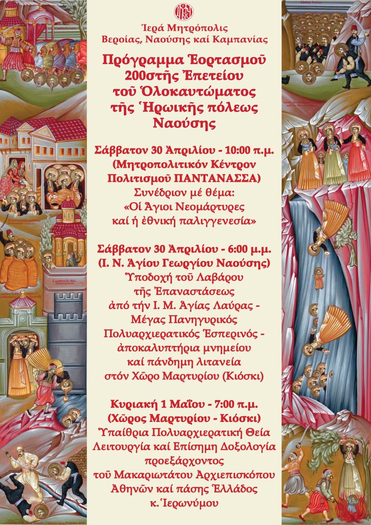Η ηρωική και αγιοτόκος πόλη της Ναούσης εορτάζει και τιμά τα 200 χρόνια από το ολοκαύτωμα της πόλεως και τη θυσία των 1241 Ναουσαίων Νεομαρτύρων.