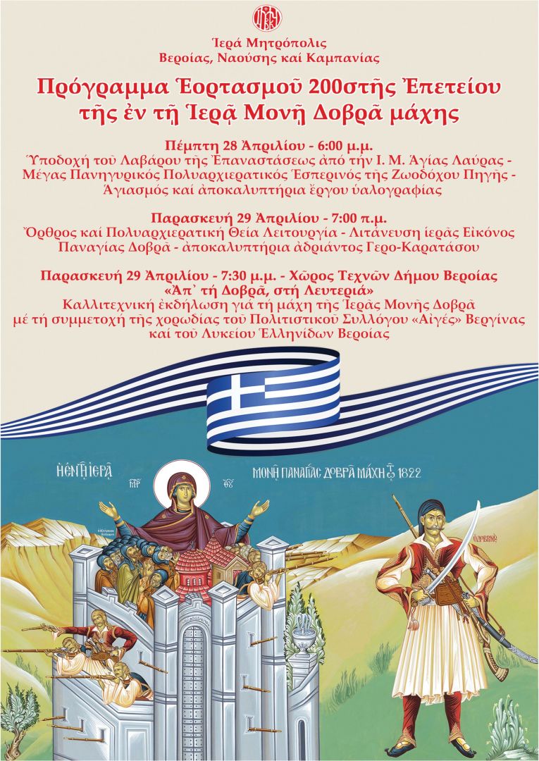 Η Ιερά Μονή Παναγίας Δοβρά Βεροίας πανηγυρίζει την εορτή της Ζωοδόχου Πηγής και τιμά τα 200 χρόνια από την ιστορική μάχη της Δοβρά το 1822.