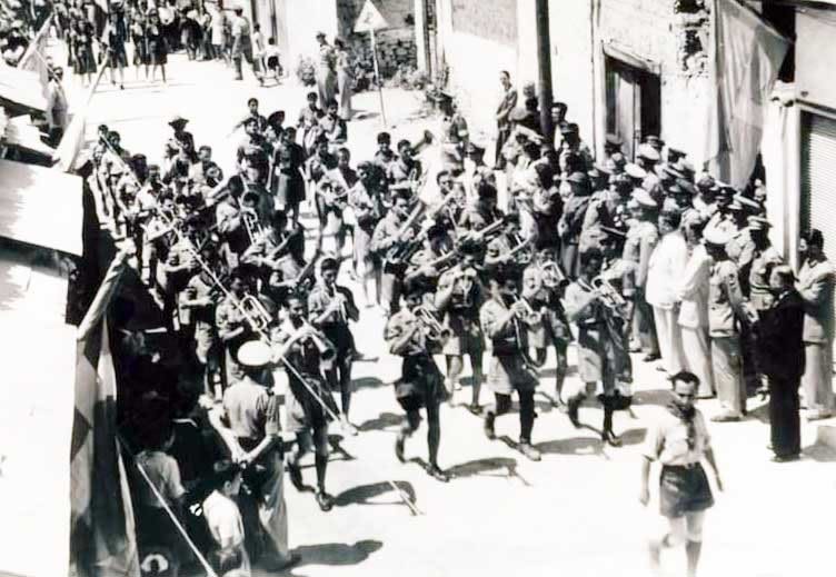 Ασπρόμαυρη φωτογραφία με την ιστορική προσκοπική μουσική μπάντα της Τοπικής Εφορείας Προσκόπων Βέροιας, η οποία παρελαύνει στην Κεντρική οδό της Βέροιας, μεταπολιτευτικά περί το 1948 (η χρονιά μπορεί να μην είναι η ακριβής) με επικεφαλής τον αρχηγό της Αναστάσιο Φελλόπουλο ο οποίος απεβίωσε το 2020 σε ηλικία 94 ετών.