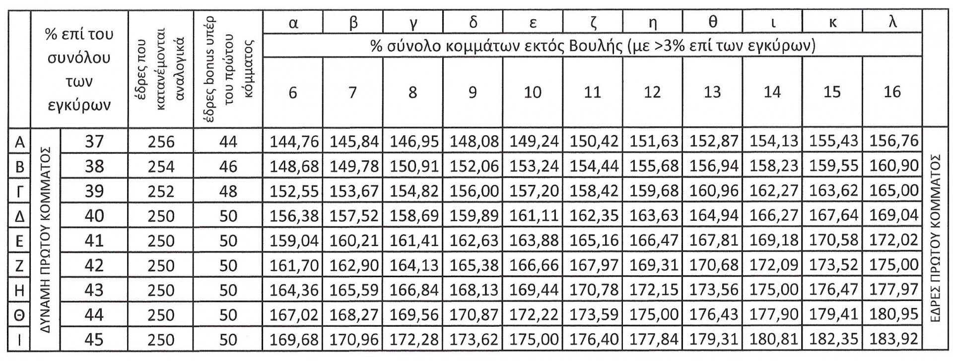 Π.χ. (για να περιοριστούμε στις ακραίες περιπτώσεις του παρατιθέμενου Πίνακα): με 37% στο σύνολο των εγκύρων και με συνολικό ποσοστό των εκτός Βουλής Κομμάτων 6%, το πρώτο Κόμμα καταλαμβάνει 144 (-145) έδρες, ενώ με 45% στο σύνολο των εγκύρων και με συνολικό ποσοστό των εκτός Βουλής Κομμάτων 16%, το πρώτο Κόμμα καταλαμβάνει 183 (-184) έδρες.