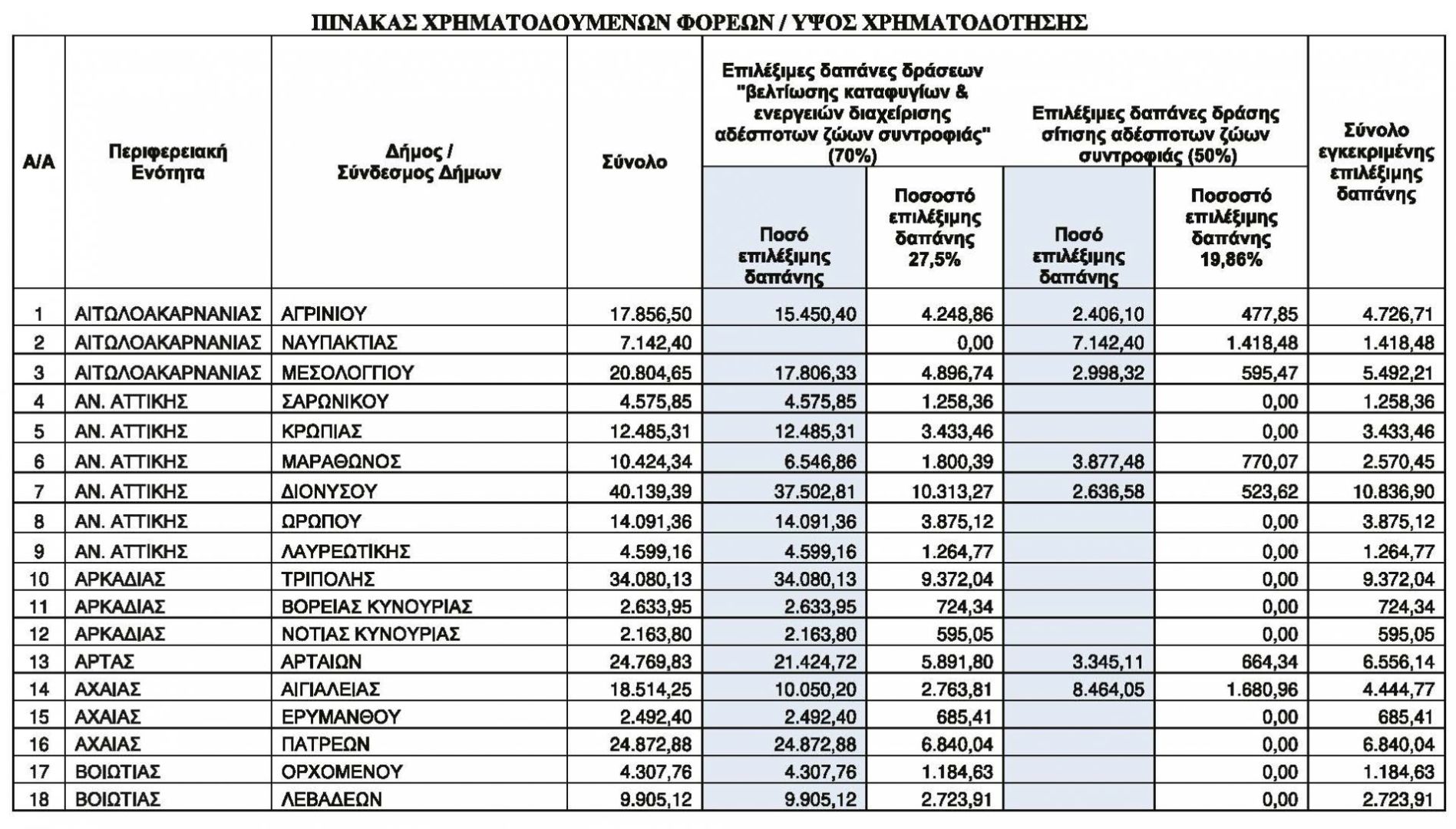 Σημειώνεται ότι ποσοστό 27,5% επί του συνόλου των επιλέξιμων δαπανών, ήτοι έως 497.321,58 €, αφορά δράσεις βελτίωσης υφιστάμενου καταφυγίου και ενέργειες διαχείρισης των αδέσποτων ζώων συντροφιάς, ενώ ποσοστό 19,86% (δηλαδή 102.667,97 €) τη σίτισή τους