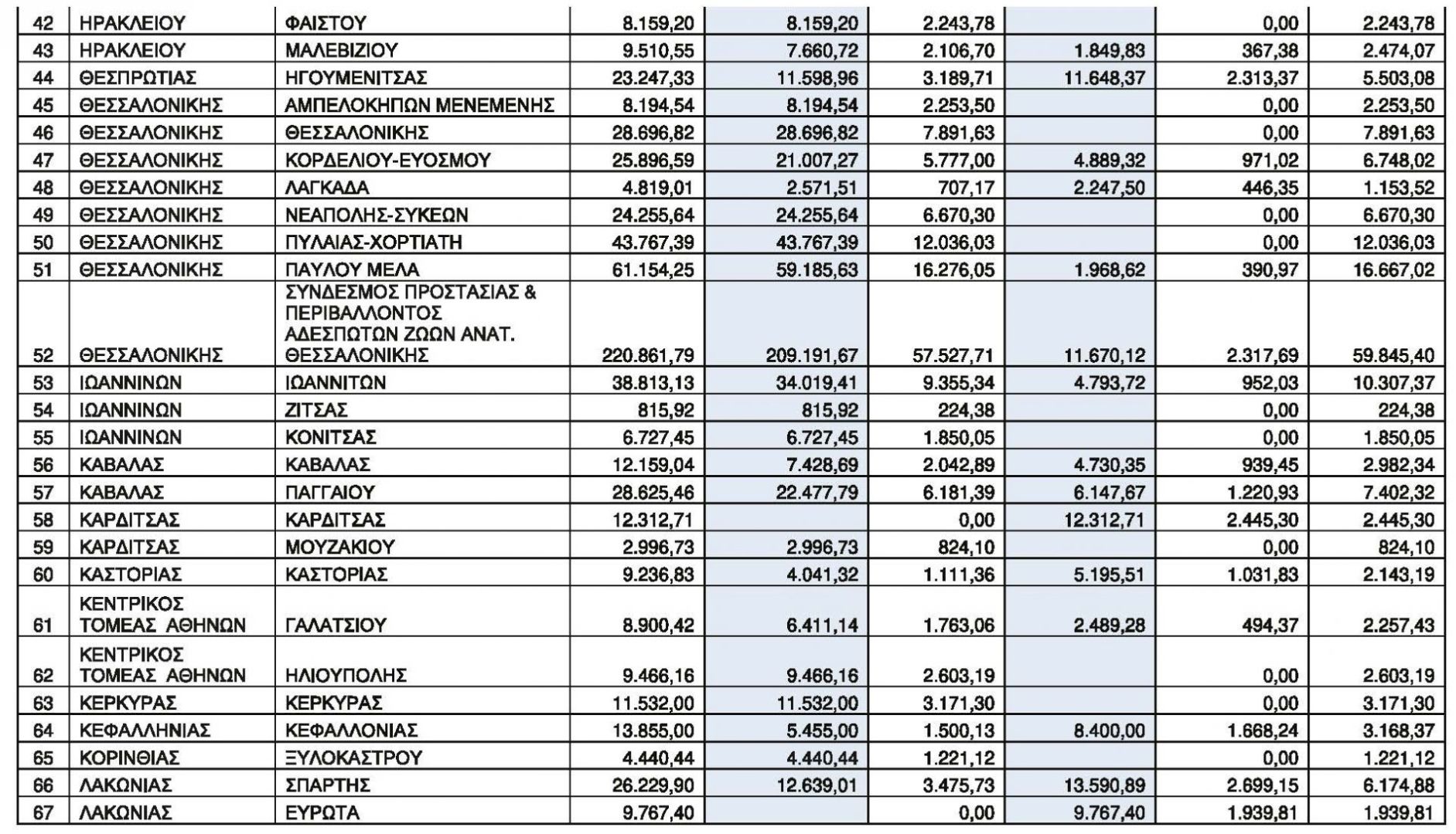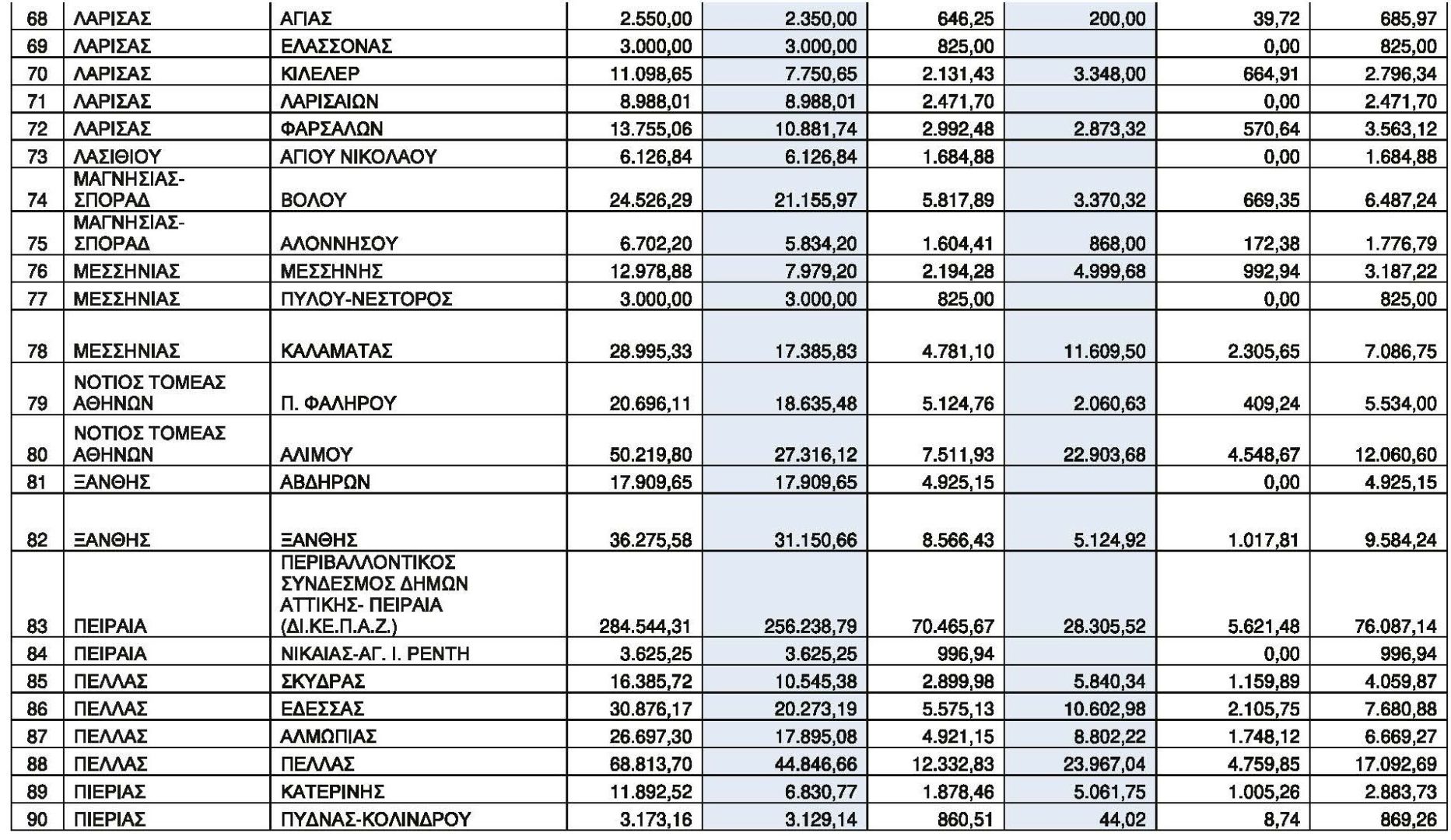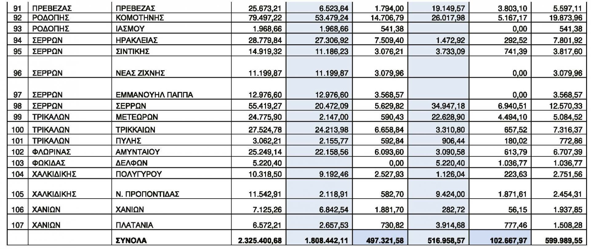 Ακολουθεί ο Πίνακας με τους 107 χρηματοδοτούμενους Δήμους και Συνδέσμους Δήμων και με το ύψος της χρηματοδότησης ανά Φορέα και κατηγορία δράσεων επιλέξιμων δαπανών: