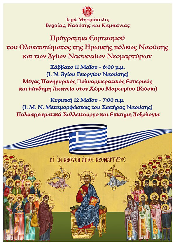 Η Ηρωική και Αγιοτόκος πόλη της Ναούσης εορτάζει και τιμά, όπως κάθε χρόνο, την Κυριακή του Θωμά το ολοκαύτωμα της πόλεως και τη θυσία των 1241 Ναουσαίων Νεομαρτύρων.
