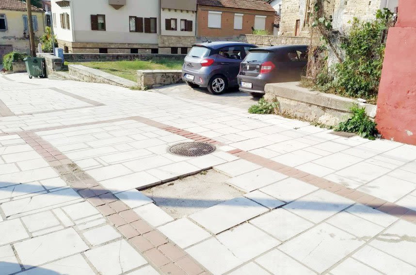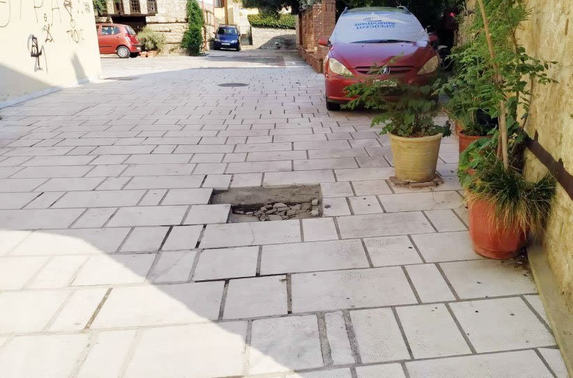 Παρά το γεγονός ότι πριν λίγους μήνες ο δήμος επιδιόρθωσε το πλακόστρωτο λίγα μέτρα παρακάτω στην είσοδο της Κυριώτισσας, δεν φρόντισαν να καλύψουν τις πλάκες που λείπουν από την οδό Ξενοπούλου. Κοντά στην εκκλησία του Αγ. Βλασίου υπάρχουν όμορφα διακοσμητικά «μωσαϊκά» από τα οποία έχουν αποκολληθεί βότσαλα και καταστρέφονται.