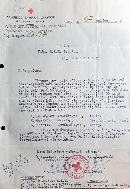 2. Στη δεματοποίηση και διανομή τροφίμων κ.ά. στους κατοίκους του Νομού Ημαθίας, στο πλέξιμο της φανέλας του στρατιώτη στο Τμήμα Αιμοδοσίας και στο ιατρείο του Περιφερειακού Τμήματος του Ελληνικού Ερυθρού Σταυρού Βέροιας.