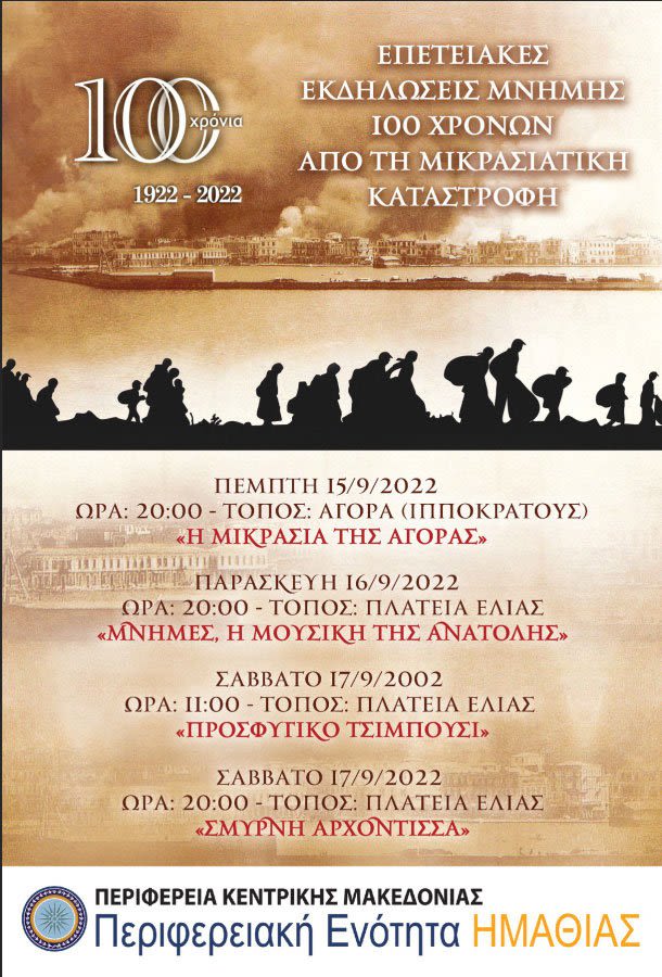 «Σε συνεργασία με τους Συλλόγους των Μικρασιατών της Ημαθίας, η Π.Ε. Ημαθίας τιμά την επέτειο των 100 χρόνων από τη Μικρασιατική καταστροφή. Σκοπός μας είναι να κρατήσουμε ζωντανή τη μνήμη των χαμένων πατρίδων μέσα από ένα τριήμερο δρώμενων με προβολή μαρτυριών και γεγονότων της πρωτοφανούς τραγωδίας του Σεπτέμβρη του 1922 και των όσων ακολούθησαν, όπου η τουρκική βαρβαρότηταμέσα από σφαγές και ανατριχιαστικές κτηνωδίες έγινε αιτία να θρηνήσουμε εκατοντάδες χιλιάδες νεκρούς και ξεριζωμένους. Πρόκειται για ένα ακόμη μελανό κεφάλαιο της σύγχρονης ιστορίας μας που, μαζί με την Γενοκτονία των Ποντίων, σημάδεψε για πάντα εκατομμύρια ψυχές Ελλήνων που γνώρισαν την προσφυγιά, τους απογόνους τους και όλο τον σύγχρονο ελληνισμό. Είναι χρέος απέναντι στα θύματα και στους πρόσφυγες, απέναντι στον τόπο και στην ιστορία, να θυμόμαστε κι αυτό το κάνουμε με συνέπεια» δήλωσε ο Αντιπεριφερειάρχης Ημαθίας, Κώστας Καλαϊτζίδης με αφορμή τη διοργάνωση των εκδηλώσεων