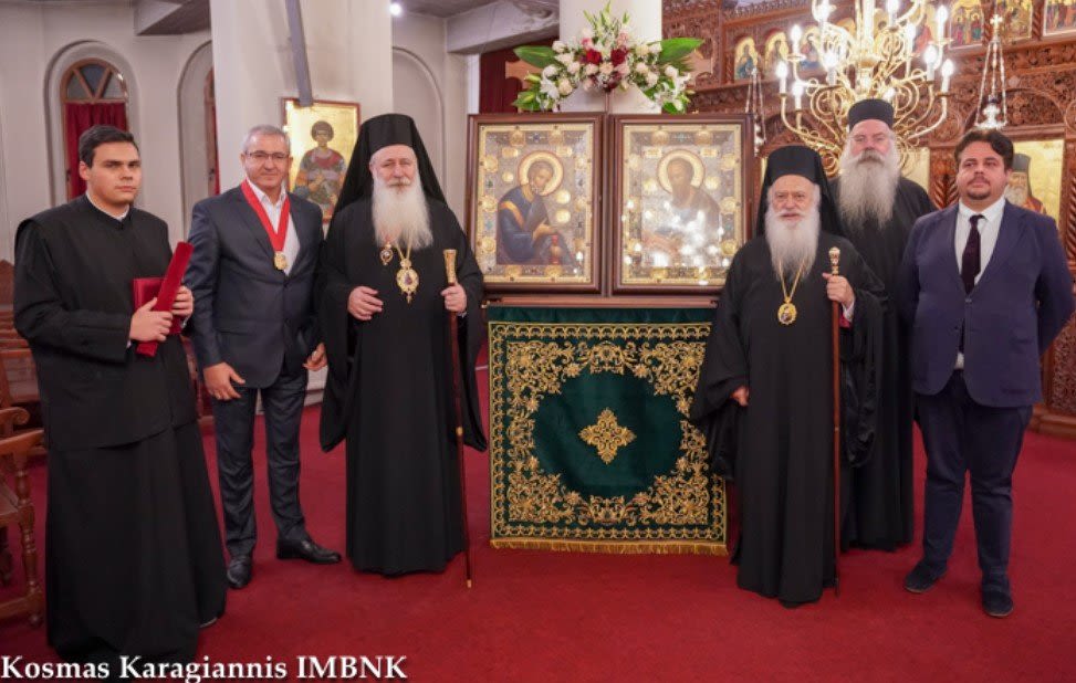 Στο τέλος ο Σεβασμιώτατος Μητροπολίτης μας, εκφράζοντας τις θερμές του ευχαριστίες για τη δωρεά των δύο εικόνων τίμησε με τον Σταυρό του Αποστόλου Παύλου τον Θεοφιλέστατο και με το μετάλλιο της Ιεράς Μητροπόλεώς μας τον κ. Μπόρη Καλιμπάτσεβ, ο οποίος κάλυψε τη δαπάνη της περίτεχνης κατασκευής τους.