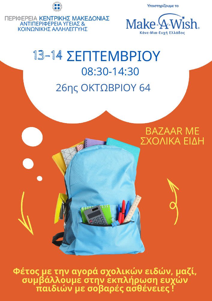 Την Τρίτη 13 Σεπτεμβρίου και την Τετάρτη 14 Σεπτεμβρίου, από τις 08.30 το πρωί μέχρι τις 2.30 το μεσημέρι, το «Make-A-Wish (Κάνε-Μια-Ευχή Ελλάδος)» διοργανώνει μπαζάρ σχολικών ειδών στην είσοδο του κτιρίου της Περιφέρειας Κεντρικής Μακεδονίας (26ης Οκτωβρίου 64). Όλα τα έσοδα από την πώληση των ειδών θα διατεθούν για την εκπλήρωση ευχών παιδιών με σοβαρές ασθένειες.
