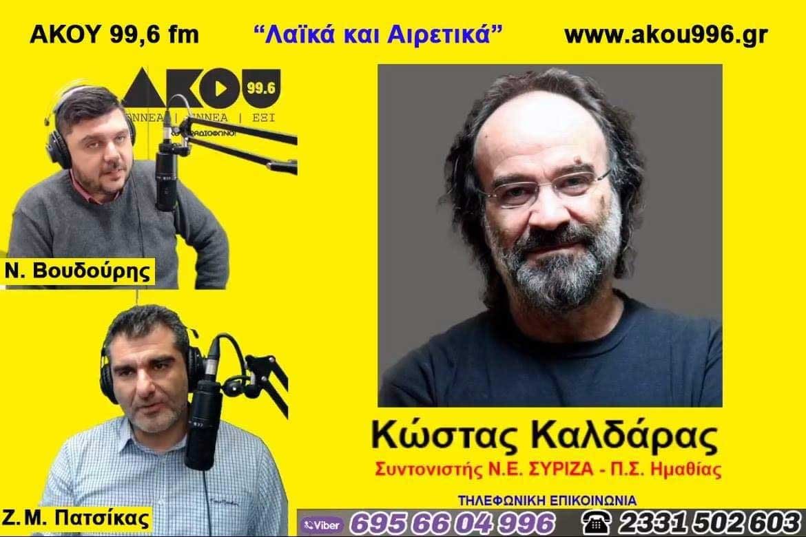 Την πρώτη συνέντευξη μετά την εκλογή του ως συντονιστής της Ν.Ε. ΣΥΡΙΖΑ-Προοδευτικής Συμμαχίας έδωσε ο Κώστας Καλδάρας το μεσημέρι της Τετάρτης(17/3)στην ραδιοφωνική εκπομπή Λαϊκά&Αιρετικά στον ΑΚΟΥ 99,6. Ο κ. Καλδάρας υπενθύμισε ότι η εκλογή του, όπως και γενικά η ανάδειξη νέων οργάνων στο κόμμα τους τελευταίους 2 μήνες είναι στα πλαίσια επανεκκίνησης του ανοίγματος στον κάθε προοδευτικό πολίτη.