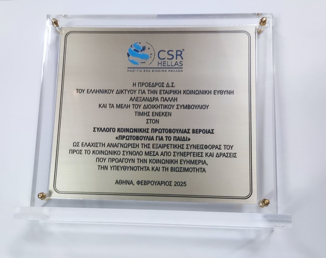 Η τιμητική διάκριση που απονεμήθηκε στην “Πρωτοβουλία για το Παιδί” από το CSR
