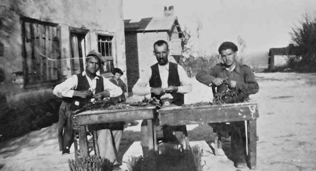Οι αδερφοί Ταραλά (αριστερά και δεξιά) κι ένας εργαζόμενος του φυτωρίου (στη μέση) ετοιμάζουν μπόλια αμπελιών. Αρχείο Σούλη Ισαακίδη