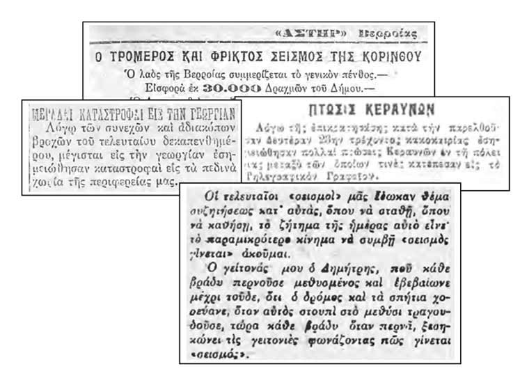 Σαν να μην έφταναν αυτά, στα μέσα του Απριλίου μεγάλος σεισμός ισοπέδωσε σχεδόν την Κόρινθο και τα περίχωρά της. Στα καφενεία είχε γίνει το βασικό θέμα συζήτησης, το Δημοτικό Συμβούλιο αποφάσισε άμεσα την εισφορά 30.000 δραχμών, παράλληλα διενεργήθηκε έρανος προς ενίσχυση των σεισμόπληκτων, ενώ φούντωσαν τα περί «συντέλειας του κόσμου»…