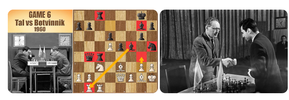 Ακολουθεί η 6η Παρτίδα από τον Παγκόσμιο Πρωτάθλημα Σκακιού 1960 μεταξύ Mikhail Botvinnik και του Mikhail Tal, η οποία θεωρείται αριστούργημα της σκακιστικής τέχνης.
