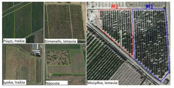 Εικόνα 1. Δορυφορικές φωτογραφίες (Google Μaps) των πέντε συλλογών που είναι εγκατεστημένες οι συλλογές ‘PeachRefPop’.