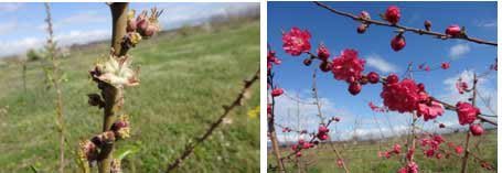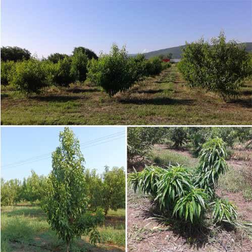 Εικόνα 3. Διαφορετική ζωηρότητα (α) και σχήματα κόμης ποικιλιών ροδακινιάς: ορθόκλαδο (β) και νάνο (γ), στη συλλογή στη Νάουσα.