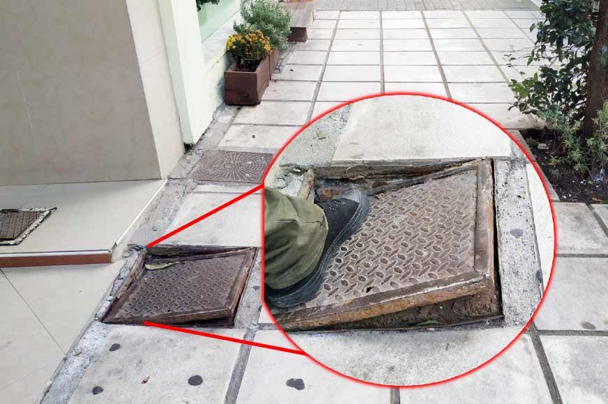 Πρόκειται για ένα παλιό μεταλλικό σκουριασμένο καπάκι, που καλύπτει μια βάνα ύδρευσης, και ο διερχόμενος κινδυνεύει είτε να σκοντάψει γιατί εξέχει, είτε να την πατήσει και να φύγει το πόδι του.
