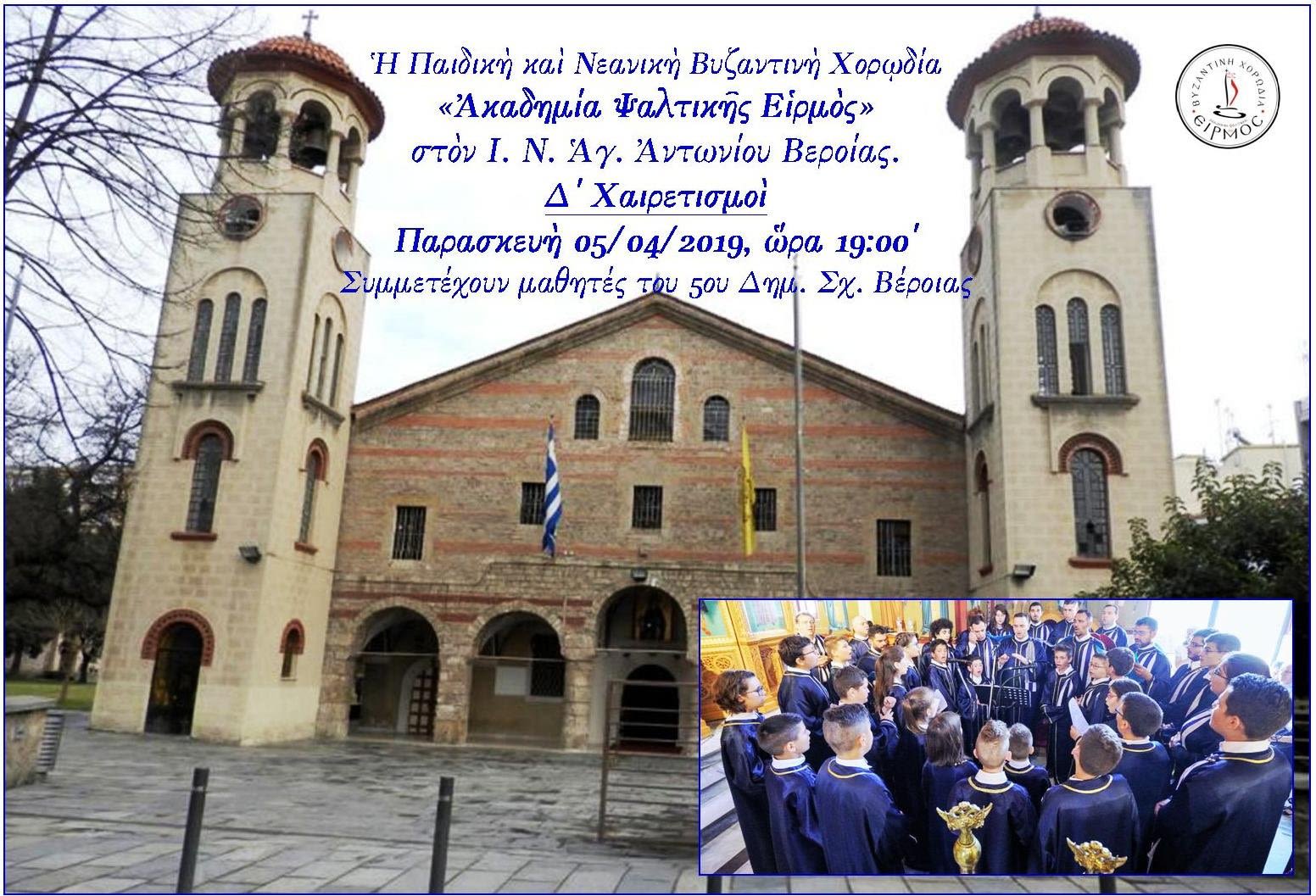 Η Χορωδία “Ακαδημία Ψαλτικής Ειρμός” και η Χορωδία της Γ’ Τάξης του 5ου Δημοτικού Σχολείου Βέροιας ερμηνεύουν την Ακολουθία των Δ’ Χαιρετισμών