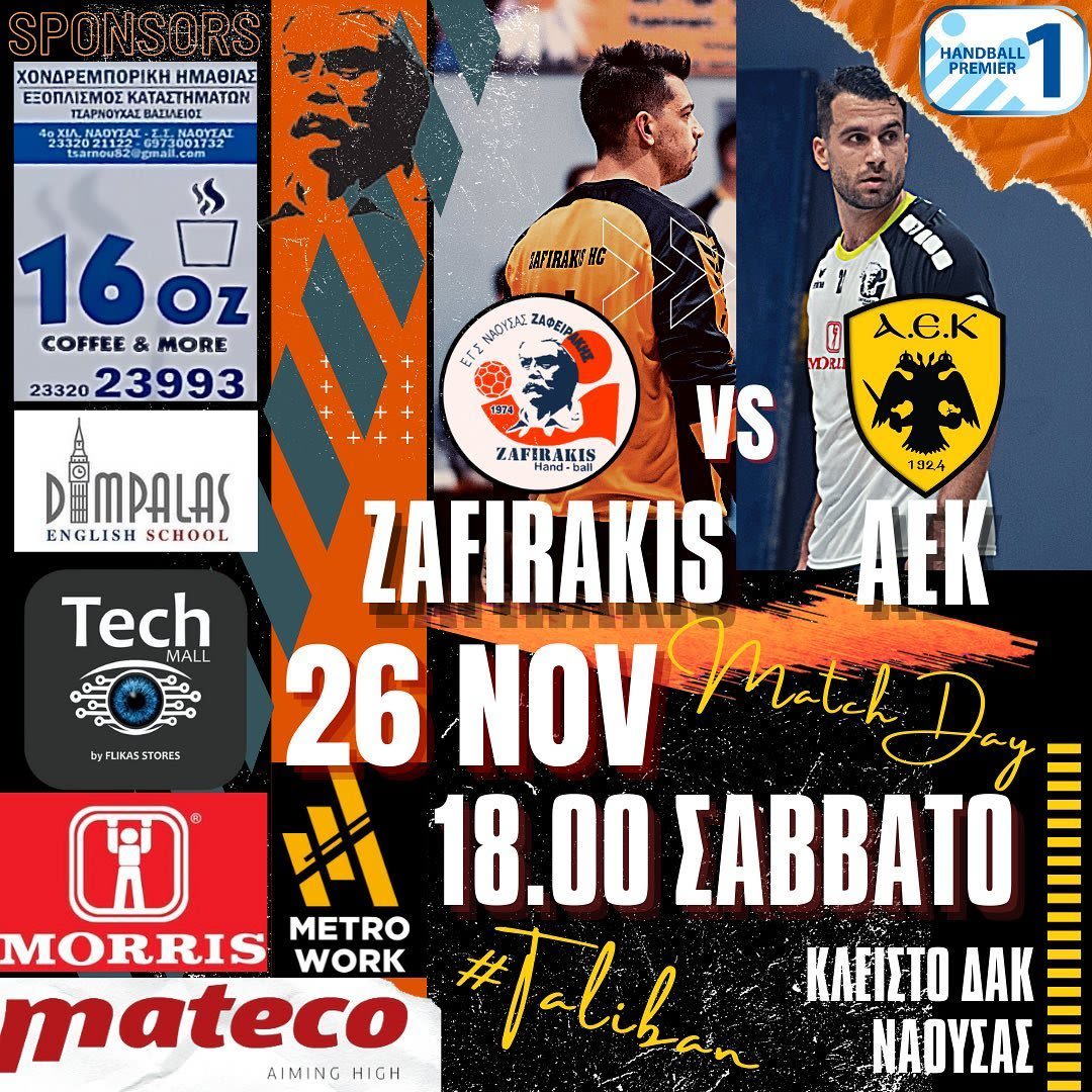 Μετά τις πολύ καλές εμφανίσεις και τις νίκες με ΧΑΝΘ και ΔΟΥΚΑ, η ομάδα μας υποδέχεται την πρωτοπόρο ΑΕΚ για την 10η αγωνιστική της Handball Premier. Η ΑΕΚ φέτος είναι αήττητη με εμπειρία έχοντας κατακτήσει τίτλους πρωταθλημάτων , κυπέλλων καθώς και πανευρωπαϊκών κυπέλλων (Challenge Cup), ωστόσο ο ΖΑΦΕΙΡΑΚΗΣ δηλώνει έτοιμος να αντιμετωπίσει στα ίσα τον αντίπαλο του, όπως ακριβώς έκανε και στα προηγούμενα ματς με όλους τους αντιπάλους αγωνιζόμενος για το καλύτερο.
