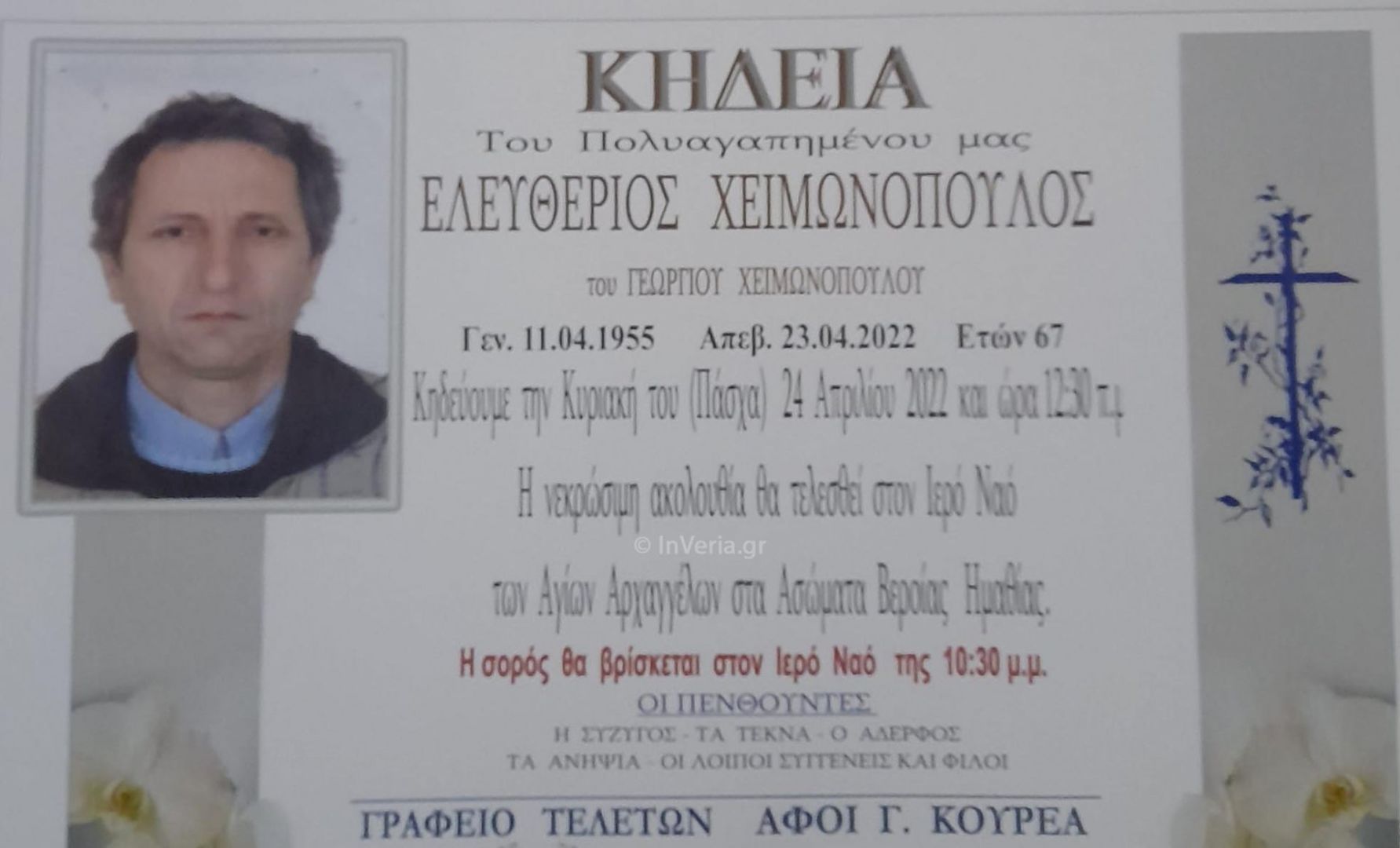 www.inveria.grΔεν τα κατάφερε να κρατηθεί στη ζωή ο Ελευθέριος Χειμωνόπουλος, ο οποίος τραυματίστηκε βαριά σε τροχαίο στην Εγνατία Οδό (κόμβο Κουλούρας) την Παρασκευή 15 Απριλίου 2022, στο οποίο έχασε ακαριαία τη ζωή της η 14χρονη κόρη του, Χριστίνα