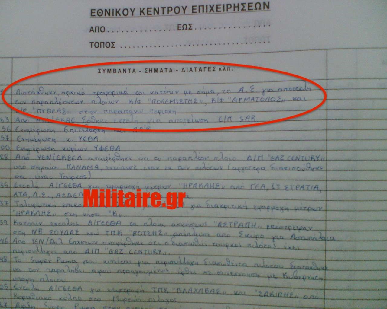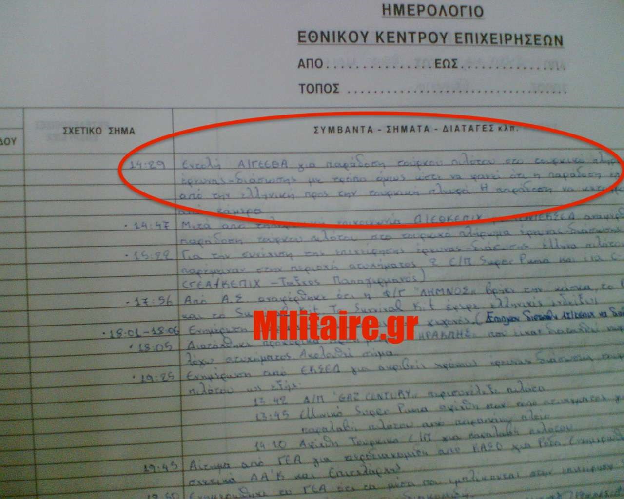 Η ώρα είναι 14.29. Η εντολή που φθάνει από το ΕΘΚΕΠΙΧ είναι μεν σαφής αλλά προκαλεί απορίες: “Εντολή Α/ΓΕΕΘΑ για παράδοση Τούρκου πιλότου στο τουρκικό πλήρωμα διάσωσης με τρόπο όμως ώστε να φανεί ότι η παράδοση έγινε από την ελληνική προς τη τουρκική πλευρά. Η παράδοση να καταγραφεί από κάμερα”.