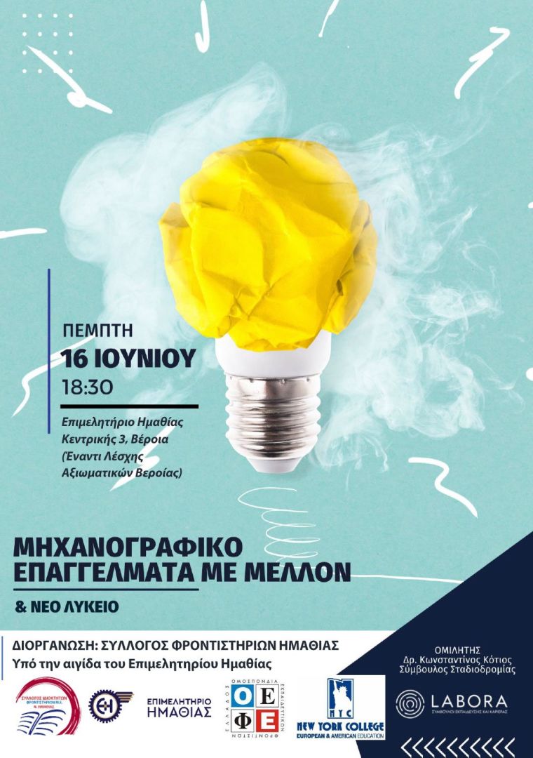 «ΕΠΑΓΓΕΛΜΑΤΑ ΜΕ ΜΕΛΛΟΝ, ΝΕΟ ΛΥΚΕΙΟ ΚΑΙ ΜΗΧΑΝΟΓΡΑΦΙΚΟ ΔΕΛΤΙΟ» σε συνεργασία με την επιστημονική ομάδα της LABORA Σύμβουλοι Εκπαίδευσης (www.labora.gr). Ομιλητής ο Δρ. Κότιος Κωνσταντίνος, Σύμβουλος Εκπαίδευσης και Καριέρας, συγγραφέας και ιδρυτής της LABORA.