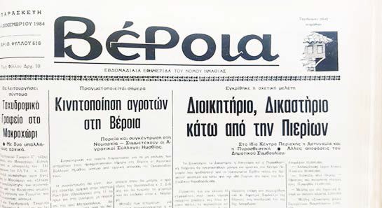 Έγραφε στο πρωτοσέλιδό της η εβδομαδιαία εφημερίδα ΒΕΡΟΙΑ, τον Δεκέμβριο του 1984: «Το διοικητήριο, το δικαστήριο, η αστυνομία και η πυροσβεστική υπηρεσία θα εγκατασταθούν μόνιμα και οριστικά στο κέντρο περιοχής Βέροιας, που προβλέπεται από το εγκεκριμένο σχέδιο πόλης και βρίσκεται αριστερά και κάτω από την οδό Πιερίων στο ύψος του βενζινάδικου Καραβασιλειάδη.