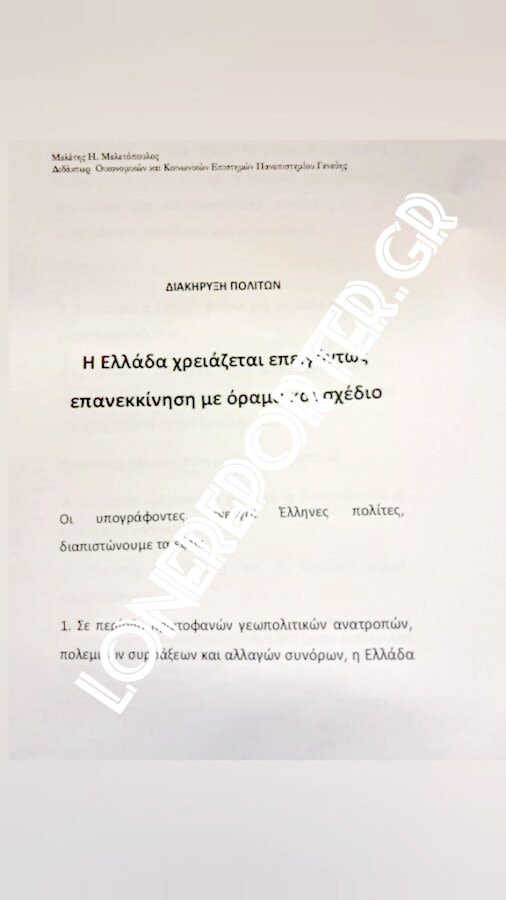 Το συγκεκριμένο κείμενο με τίτλο “διακήρυξη πολιτών”, φέρονται να έχουν αποδεχθεί για να υπογράψουν αρκετές προσωπικότητες, αλλά ας περιμένουμε πρώτα να «σκάσει» επίσημα η είδηση για να δούμε και τις υπογραφές.