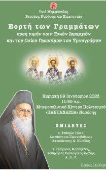 Η Ιερά Μητρόπολις Βεροίας, Ναούσης και Καμπανίας σας προσκαλεί στην Εορτή των Γραμμάτων προς τιμήν των Τριών Ιεραρχών που θα πραγματοποιηθεί την Κυριακή 29 Ιανουαρίου 2023 και ώρα 11:30 π.μ. στο Μητροπολιτικό Κέντρο Πολιτισμού ΠΑΝΤΑΝΑΣΣΑ Ναούσης (έναντι του Ιερού Ναού Παναγίας).