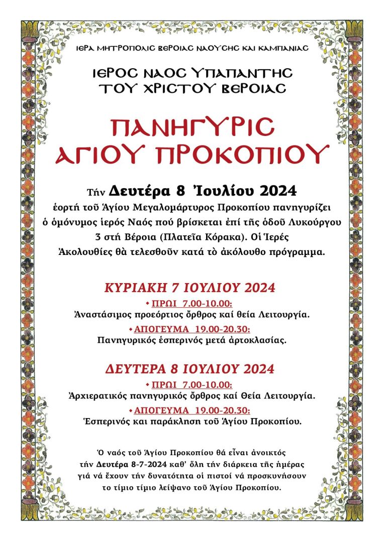 Προκοπίου θά εἶναι ἀνοικτός τήν Δευτέρα 8-7-2024 καθ᾿ ὅλη τήν διάρκεια τῆς ἡμέρας γιά νά ἔχουν τήν δυνατότητα οἱ πιστοί νά προσκυνήσουν το