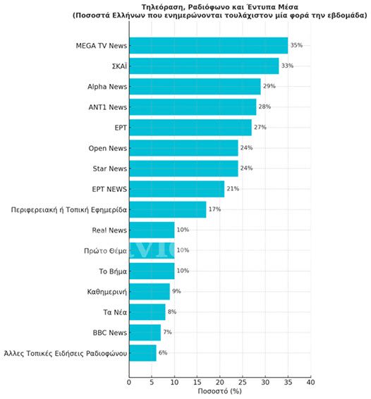 Αντίστοιχα, ο Περιφερειακός Τύπος συγκεντρώνει το χαµηλότερο ποσοστό δυσπιστίας από τα ελληνικά Μ.Μ.Ε. µε ποσοστό µόλις 21%, ενώ ακολουθούν in.gr και Καθηµερινή µε ποσοστό 30%.