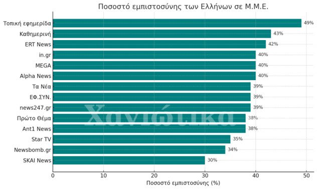 Μεγάλη πρωτιά για τον Περιφερειακό Τύπο και στον τοµέα της εµπιστοσύνης των πολιτών απέναντι στα Μ.Μ.Ε., µε την τοπική εφηµερίδα να καταγράφει ποσοστό εµπιστοσύνης 49%, το µεγαλύτερο στην Ελλάδα, αφήνοντας στη δεύτερη θέση την εφηµερίδα ‘‘Καθηµερινή’’ µε ποσοστό 43%, ενώ ακολουθούν η ΕΡΤ µε 42%, και το in.gr, ο ALPHA και το MEGA µε ποσοστό 40%.