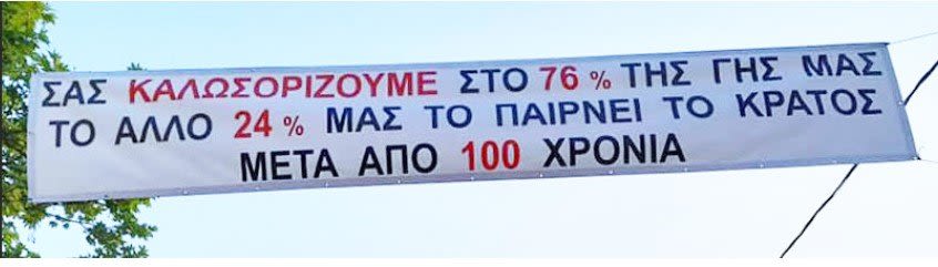 Στην είσοδο, λοιπόν, του χωριού τοποθετήθηκε μεγάλο πανό που καλωσορίζει όσους εισέρχονται στο χωριό, αλλά όχι σε όλη την περιοχή, παρά μόνο στο 76% αυτής, καθώς το υπόλοιπο 24% το παίρνει το Δημόσιο, 100 χρόνια μετά…