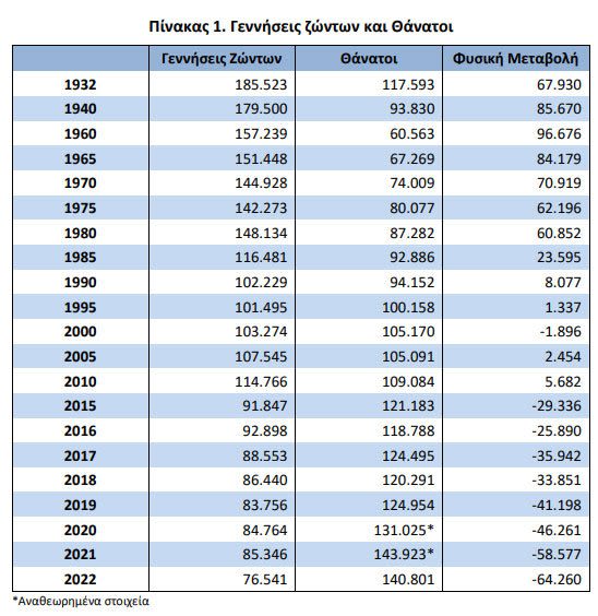 Χαρακτηριστικά είναι τα στοιχεία σε βάθος χρόνου που αποτυπώνονται στον πίνακα, από το 1932 έως το 2022 στην Ελλάδα.