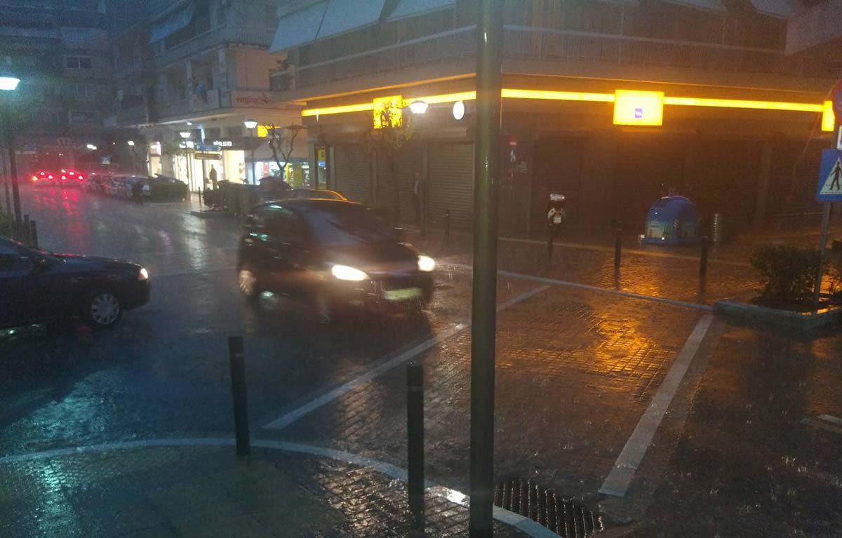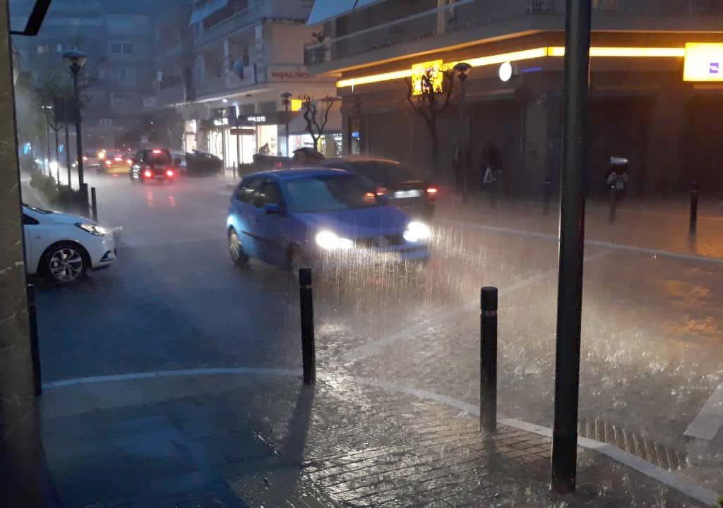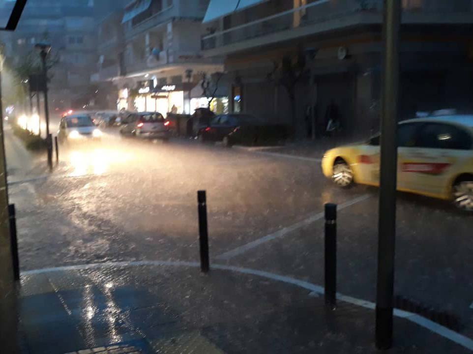 Αν και από νωρίς είχε ρίξει λίγες ψιχάλες, τίποτα δεν προμήνυε την ξαφνική μπόρα με αστραπές και έντονη βροχόπτωση που πέρασε και πλημμύρισε σε μόλις λίγα λεπτά τους κεντρικούς δρόμους της πόλης.