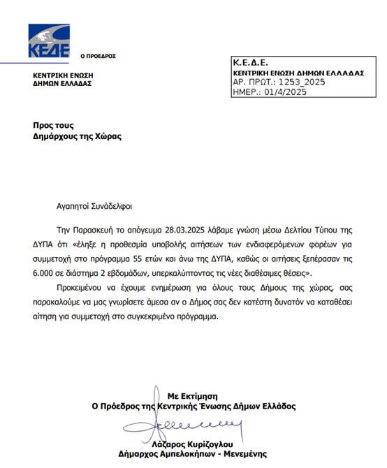 Παράλληλα ο πρόεδρος της Κεντρικής Ένωσης Δήμων Ελλάδας (ΚΕΔΕ), απέστειλε επιστολή προς τους Δημάρχους όλης της χώρας, προκειμένου να διαπιστώσει πόσοι από αυτούς παρέμειναν εκτός του προγράμματος απασχόλησης ανέργων ηλικίας 55+ ετών.