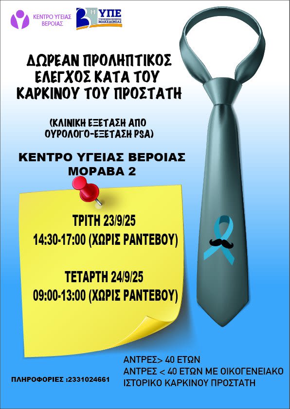 Με στόχο την ενημέρωση και ευαισθητοποίηση του ανδρικού πληθυσμού, το Κέντρο Υγείας Βέροιας με τον ουρολόγο της μονάδας, κ. Χρυσάφη Βασίλειο Επιμελητή Α΄ διοργανώνει δράση με δωρεάν προληπτικό έλεγχο κατά του καρκίνου του προστάτη (κλινική εξέταση και έλεγχος PSA).