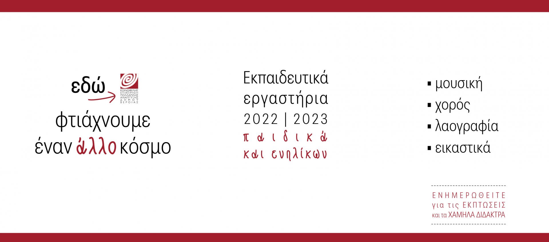 Δευτέρα 29 Αυγούστου 2022 ξεκινούν οι εγγραφές στα τμήματα της Κοινωφελούς Επιχείρησης Πολλαπλής Ανάπτυξης Δήμου Βέροιας. Επιλέξετε το τμήμα που σας ταιριάζει και περάστε δημιουργικά τις ελεύθερες ώρες σας, στην Αντωνιάδεια Στέγη Γραμμάτων και Τεχνών.
