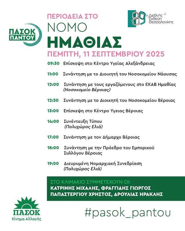 Η Νομαρχιακή Επιτροπή Ημαθίας του ΠΑΣΟΚ – Κίνημα Αλλαγής σας ενημερώνει ότι αύριο Πέμπτη 11 Σεπτεμβρίου 2025, κλιμάκιο στελεχών του Κινήματος θα πραγματοποιήσει περιοδεία στο Νομό Ημαθίας, στο πλαίσιο της 89ης Διεθνούς Έκθεσης Θεσσαλονίκης.