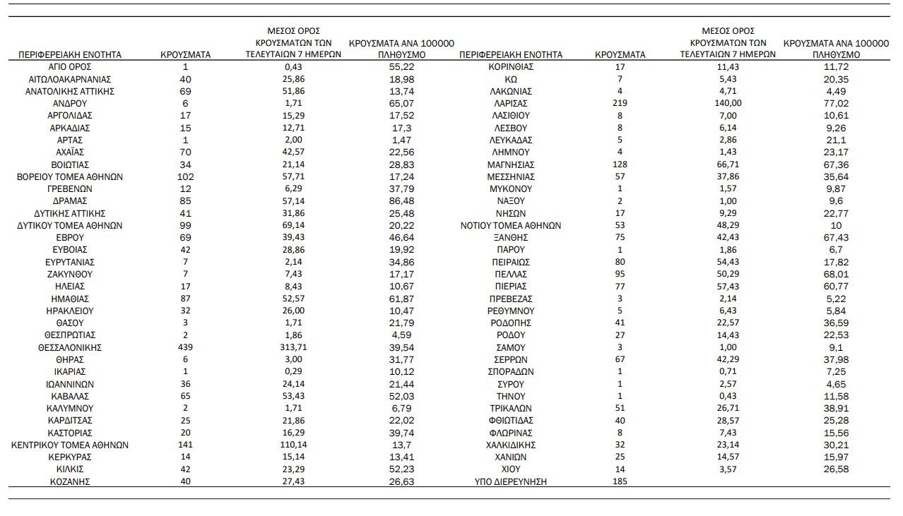 Ημερήσιος αριθμός και κρούσματα ανά 100.000 πληθυσμού επιβεβαιωμένων εγχώριων κρουσμάτων COVID-19 ανά περιφερειακή
