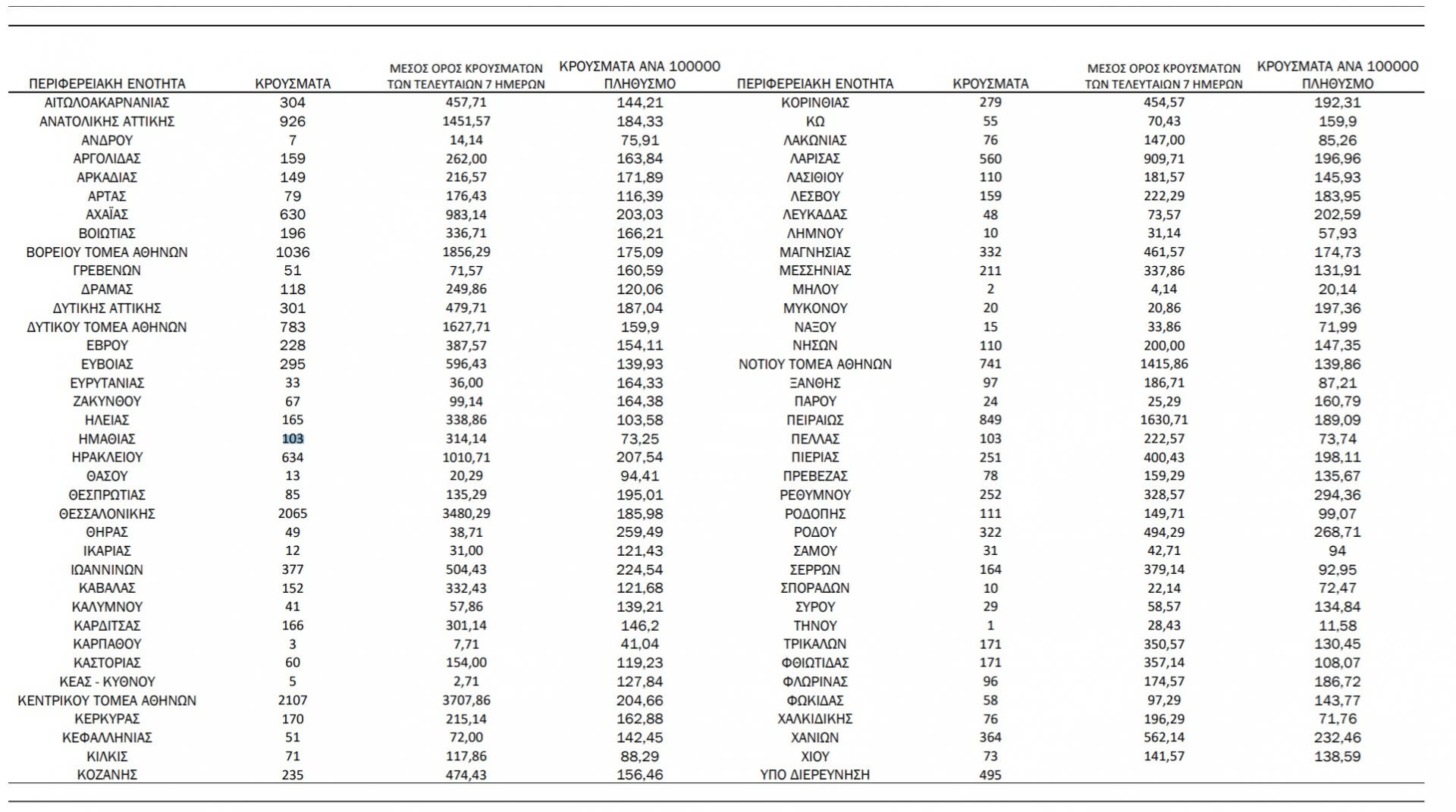 Δείτε στον πίνακα τα κρούσματα ανά περιφερειακή